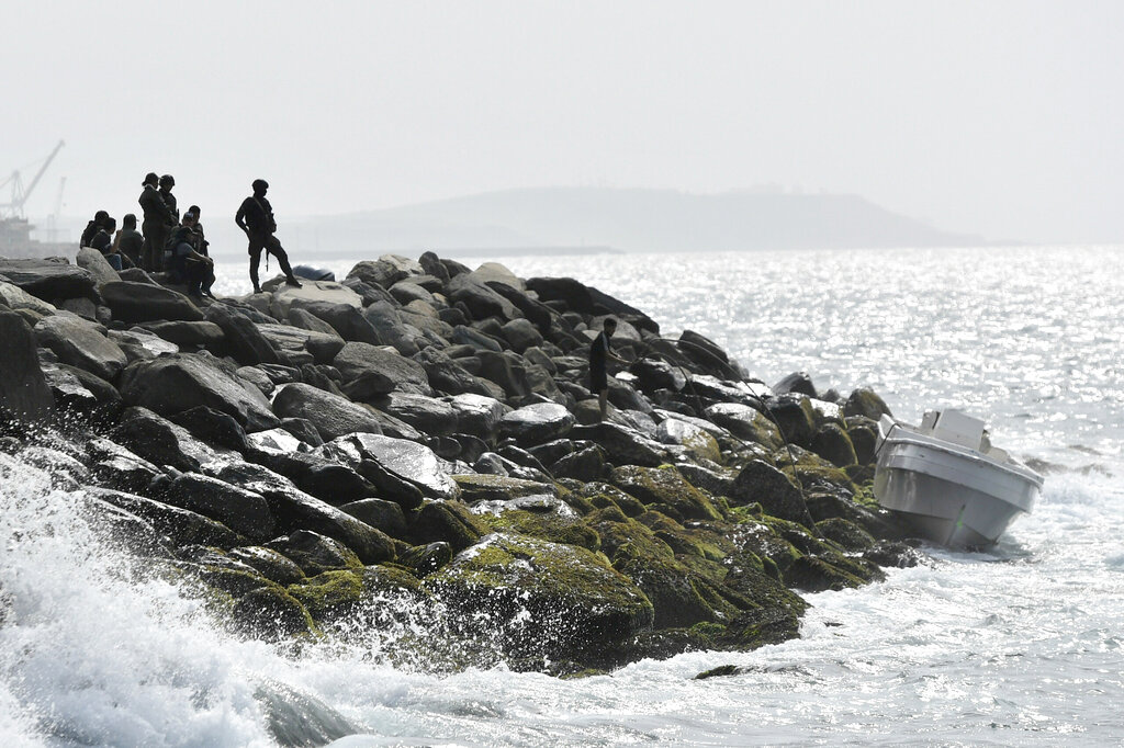 FAILAS – Šioje 2020 m. gegužės 3 d. nuotraukoje Venesuelos saugumo pajėgos saugo krantą ir valtį, kurioje, kaip teigia valdžios institucijos, ginkluotų vyrų grupė išsilaipino uostamiestyje La Guaira, Venesueloje, vadindamos tai ginkluotu jūriniu įsibrovimu iš kaimyninės Kolumbijos. 2021 m. gegužės 18 d., antradienį, Kolumbijos teisėjas nuteisė tris Venesuelos vyrus šešeriems metams kalėjimo už pagalbą organizuojant neapgalvotą sąmokslą nuversti prezidentą Nicolás Maduro, į kurį buvo įtraukti buvę Amerikos žaliosios beretės. (AP Photo/Matias Delacroix, archyvas)