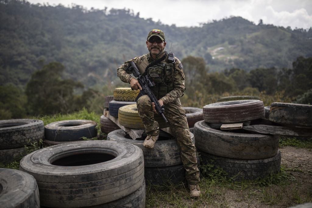 Hector Bernal, karinis instruktorius, pozuoja nuotraukai La Mesa, Kolumbijoje, trečiadienį, 2024 m. sausio 10 d. Bernal, pensininkas karo medikas, kuris vadovauja taktinės medicinos centrui už Bogotos ribų, sako, kad per pastaruosius aštuonis mėnesius jis apmokė daugiau nei 20 kolumbiečių, kurie vėliau išvyko kariauti į Ukrainą. Jis sako, kad profesionalus karys, turintis šešerių metų tarnybos armijoje stažą, Kolumbijoje uždirba ne daugiau kaip 600 dolerių per mėnesį, o Ukrainoje kariai gauna nuo 3000 iki 4000 dolerių per mėnesį. (AP Photo/Ivan Valencia)