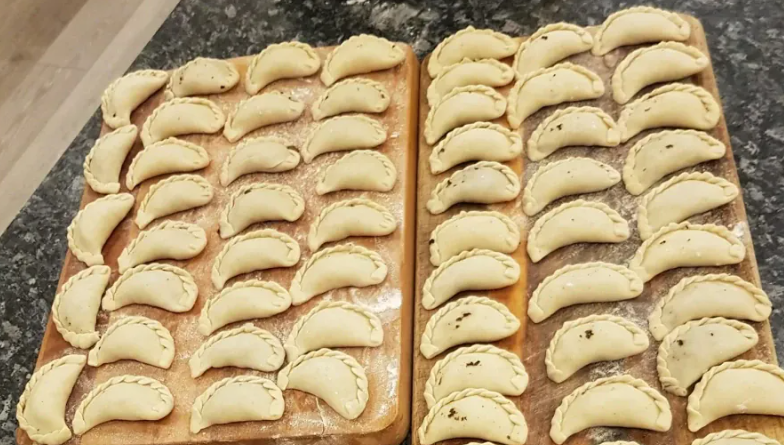 Šefo patarimas: Naudokite grybų mirkymo vandenį padažui – tai sustiprina aromatą! Ingredientai: tešlai – 3 stiklinės miltų, 1 stiklinė aliejaus, 1 stiklinė verdančio vandens. Įdarui: 2-3 saujos džiovintų grybų, 1 svogūnas, aliejus, druska. Padažui: 1 svogūnas, 1 česnakas, petražolės, prieskoniai.