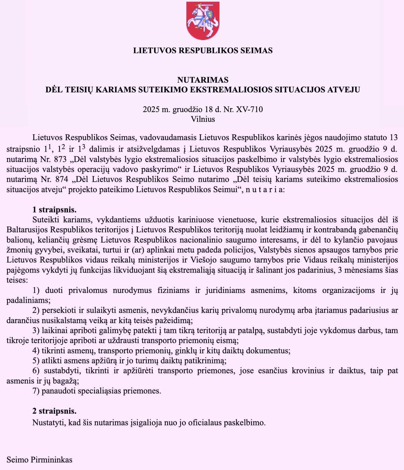 Gruodžio 18 d. Lietuvos Seimas bėgte priėmė nutarimą, kuris primena senus gerus COVID-19 laikus, kai visi staiga tapo pavojingi ir reikėjo griežtos kontrolės. Dabar, esą dėl „hibridinių išpuolių“ ir sudėtingos situacijos prie sienos, kariuomenė gauna teisę duoti privalomus nurodymus piliečiams, tikrinti dokumentus, sulaikyti, riboti judėjimą ir net naudoti specialiąsias priemones. Oficialiai – tik pagalbai policijai ir pasienio tarnybai. Bet ar tikrai? O gal tai tylus žingsnis link karinės valstybės, kur kareivis gatvėje gali sustabdyti tave už „įtartinus“ veiksmus?